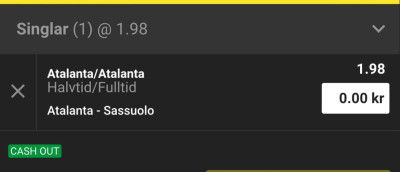 Sassuolo ligger bara 1p över nedflyttningsstrecket, med formen de har nu måste de börja samla poäng men det blir inte lätt när lagets överlägset största stjärna och skyttekung Berardi saknas igen. Lagen möttes för 5v sedan på denna arena i cupen, det stod 1-0 hl och slutade 3-1. Jag kan mkt väl tänka mig att det blir likadant igen och testar ett halvtidsspel som Atalanta har jobbat hem åt oss förut till bra odds.