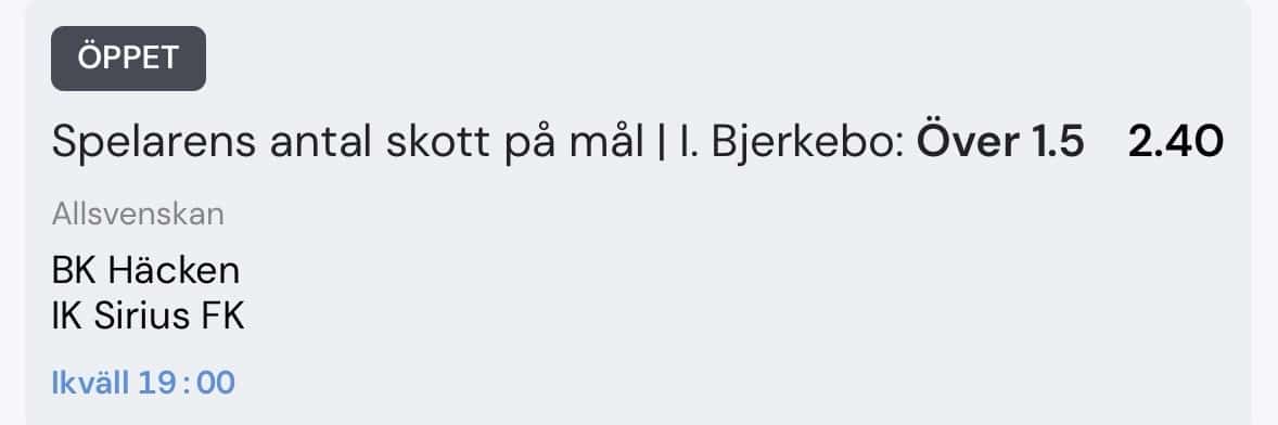 Jag väljer att spela Bjerkebo över 1.5 skott på mål till oddset 2.40 hos Betsson.