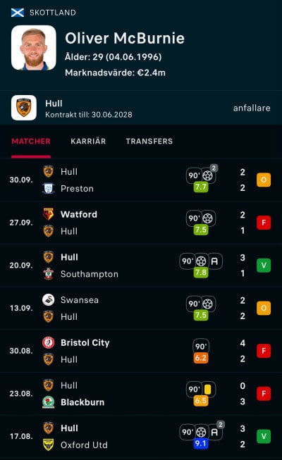 Hull har inlett säsongen lika svajigt som vanligt. De står på raden 2-3-3 med målskillnad 13-16 och är ligans målrikaste lag med ett snitt på 3.6 mål i sina matcher ! Det är något man kan tacka anfallaren Oliver McBurnie för. Han toppade skytteligan (fram tills igår) på 6 mål efter 8 matcher, förutom dessa kassar har han gjort 3st assist med så han toppar assistligan också.