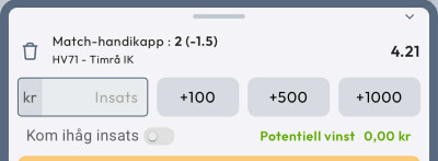 Jag gillar att spela på formstarka lag mot formsvaga, men det betyder såklart inte att spelet måste sitta för det. Men SHL är lite lurigt i början av säsongen innan alla spelat ihop sig, och när man får 2.71x på Timråseger och t.o.m 4.21x på -1.5 så måste jag hugga till.