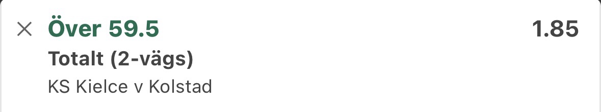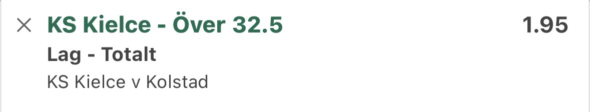 Vi tar oss till Polen och CL mötet mellan Kielce och Kolstad. Den ena linan ligger från 1.67-1.85 och spelvärdet hittas hos Bet365. Totalt spelas 6 units på 2 olika linor.