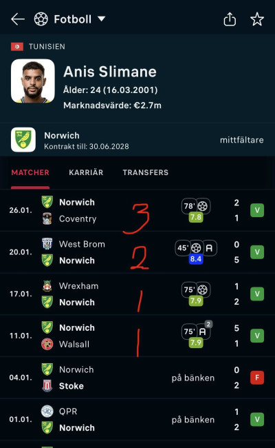Han har på 3,5 match gjort mål i 3 raka matcher och bidragit med 3st assist. Och då va det han som gjorde det viktiga 1-1 målet mot tabell 1an Coventry senast som till slut blev en 2-1 seger. Det är tufft motstånd igen men Anis Slimane går på moln just nu som hela Norwich gör.