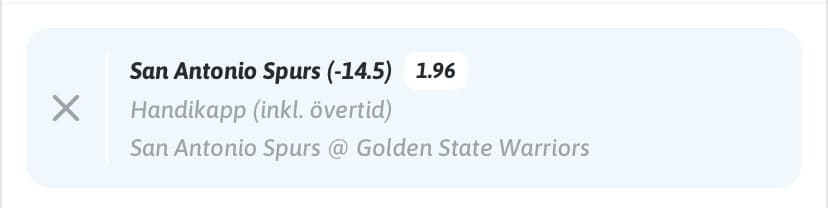 Spurs är omänskligt bra och Warriors är rejält desarmerade med Curry, Butler, Horford, Melton, Moody, Porzingis och Post på skadelistan. Dessutom är Santos och Payton osäkra till spel. Tränare Kerr får gräva djupt på bänken här. Spurs gör det mesta rätt och får ett ypperligt tillfälle här att trycka till Warriors rejält efter att Curry och Butler var faktorerna som gav Warriors segrar i lagens tidigare möten. Med nuvarande form som råder i respektive lag lirar jag Spurs -14,5 poäng till 1,96 utan att tveka.