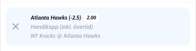 Hawks går ruggigt bra med 13 raka hemmavinster och 18 av 20 senaste matcherna har man segrat. Knicks har vunnit de ”enkla” matcherna mot sämre motstånd men haft desto svårare mot lagen på övre halvan av tabellen. Efter att ha torskat 3 raka och sen studsat tillbaka mot Grizzlies och Bulls övertygar inte. Här får man möta riktigt motstånd igen och det är mot ett formtoppat Hawks på bortaplan. Dessutom frågetecken kring Towns. Ge mig hemmalaget -2,5 poäng till 2x degen tack.