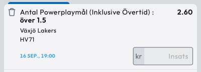 Spelet är ö1.5 powerplaymål. Det brukar ligga någonstans mellan 2.20-2.60x i odds och till denna match får vi just 2.60x på att detta ska ske.